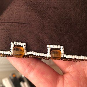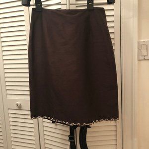 Oscar de La Renta silk brown/maroon color, with embroideries in pearls all around the lower edge of the skirt. Fitted skirt. Measures approximately when laying flat: waist 15", and length 23", Zip up on back, Size 10