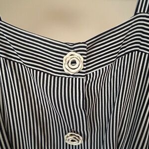 This is an excellent condition used Oscar De La Renta Striped 100% Silk Jumpsuit with metal Floral buttons. Perfect for a summer wedding or fancy BBQ.