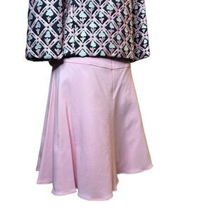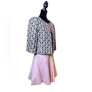Jacket: 100% silk with polyester trim. Hook and eye top closure. Cropped style. Pink/White/Black. No holes or stains. Some thread pulls on embroidery. Size 6. AP to AP 18”. Shoulder to hem: 20”