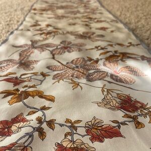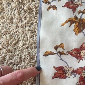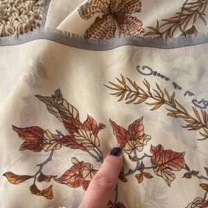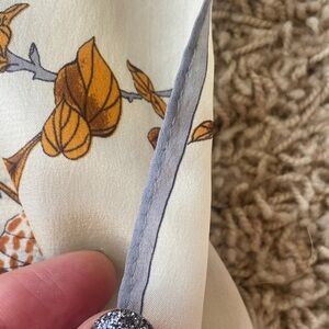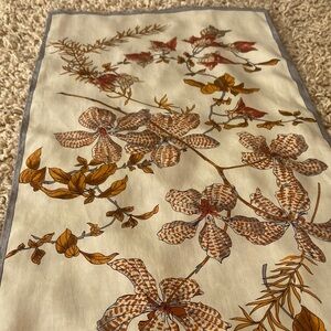 Chic authentic vintage silk scarf by Oscar de la Renta. Features autumn leaves in brown and tan on a cream base with rolled hem. This is vintage still in EUC but few tiny fraying with the rolled silk hem. Can’t see the imperfections but I tried to picture some of them in last 3 pictures. Final sale
