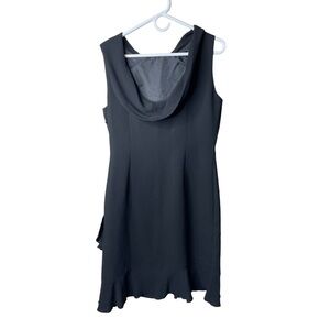 Step into timeless elegance with this stunning black Oscar de la Renta dress in size 10. Designed with a draped cowl neckline and soft ruffle hem, this piece radiates classic sophistication with every step. Perfect for formal events, cocktail parties, or an elevated evening out.