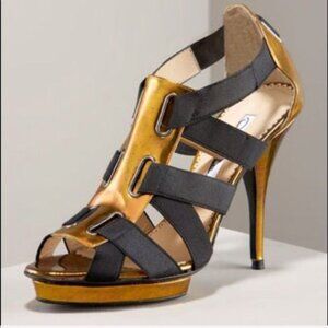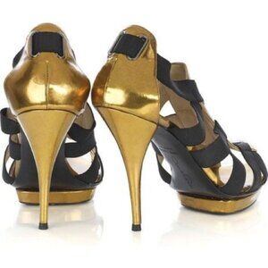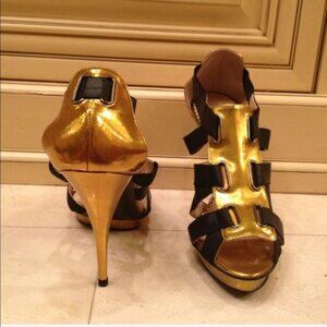 Oscar de la Renta Grommet Black and Gold Platform Shoes. 5” heel with an 1” platform. New without box. These are some of my favorite designed shoes. They were so gorgeous that I showed them off in my real real closet even though they were a half size too small for me. I bought at Neiman Marcus. Beautiful.
