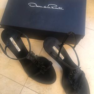 Black satin T strap ruffle front heels in size 8.5 with original box by Oscar de la Renta original retail for $495