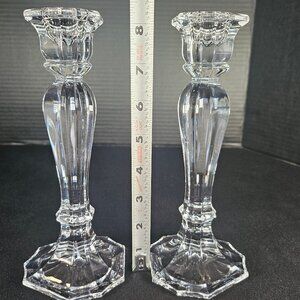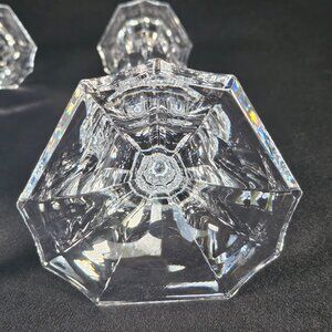 Simply elegant pair of Oscar de la Renta Chippendale, Australian. 24% lead crystal unique, 9 sided candlestick candle holders. The refraction on these are top notch. They were made in 2002 in Austria. They measure 8.25 inches tall. And the base stand is 3.5 inches in diameter. Highly polished finish. A very luxurious pair that will add a touch of elegance wherever they are placed. In excellent condition. No damage, chips or cracks. Dimensions. 8.5 inches tall. Base 3.5 inches top 2 inches wide. Non smoking pet free home. ERC#12