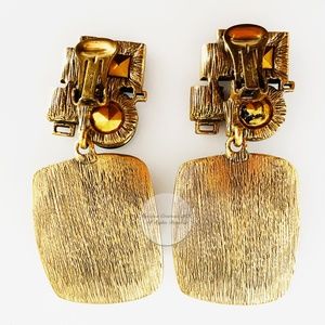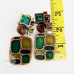 Oscar de la Renta modernist dangle earrings, most likely made in the 1980s. Clip style. Made from brass colored metal with modernist shapes and crystals in shades of lime, emerald and topaz. Approximately 3"L x 1.5in W. Preowned/vintage with some signs of use & prior wear: each earring shows fine surface scratching. Stamped Oscar de la Renta on each earring back.