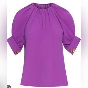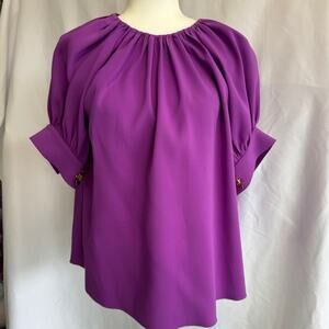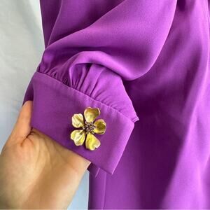 Gorgeous purple blouse with gold flower detail buttons. There’s a snag on the back that you can barely see but pictured.