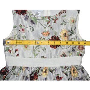 Pretty dress with jacquard floral design on pale gray tone background. Center back zipper. Dress is lined. Layer of tulle attached to skirt lining. Has a sticker and slight discolor to inner label. Otherwise great gently used condition. size is 8Y. Chest approx. 26, length approx. 28 3/4 inches.