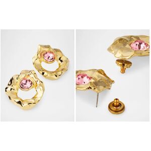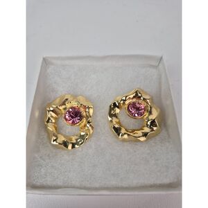 These striking earrings feature a bold, round-cut glass crystal as the centerpiece, surrounded by a gilded ring. The unique texture of the gold-tone setting adds depth and dimension, contrasting beautifully with the glimmer of the glass crystal.