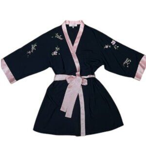 Oscar de la Renta Kimono Robe Medium Black w/Pink Satin Trim Floral Embroidery
