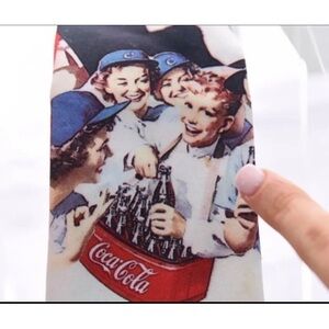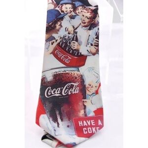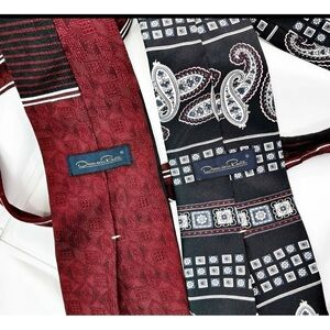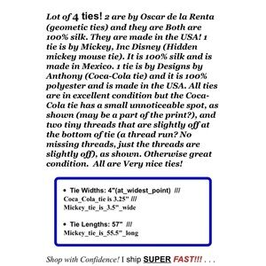 Lot of 4 ties! 2 are by Oscar de la Renta (geometic ties) and they are Both are 100% silk. They are made in the USA! 1 tie is by Mickey, Inc Disney (Hidden mickey mouse tie). It is 100% silk and is made in Mexico. 1 tie is by Designs by Anthony (Coca-Cola tie) and it is 100% polyester and is made in the USA. All ties are in excellent condition but the Coca-Cola tie has a small unnoticeable spot, as shown (may be a part of the print?), and two tiny threads that are slightly off at the bottom of tie (a thread run? No missing threads, just the threads are slightly off), as shown. Otherwise great condition. All are Very nice ties!