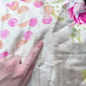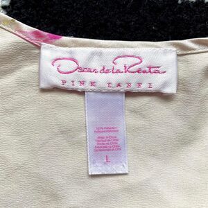 Gorgeous peach floral slip from the designer brand Oscar de la Renta. Wide straps and the prettiest pink and green floral polka dot pattern. Some light wear and snags throughout, but no major flaws. Pilling / snags reflected in price.