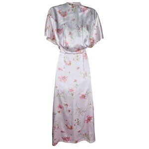 Delicate nightwear set featuring a soft satin gown with lace details and a matching robe, adorned with soft pink floral prints that evoke a sense of feminine elegance.