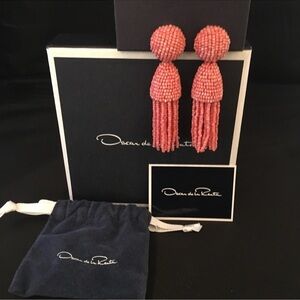 These Oscar de la Renta earrings feature a vibrant pink hue with intricate beadwork, creating a luxurious and eye-catching accessory. The long, flowing tassels are densely packed with tiny beads, offering a sophisticated yet playful look. The clip-on style ensures a comfortable fit, making them perfect for adding a dramatic flair to any ensemble.