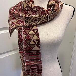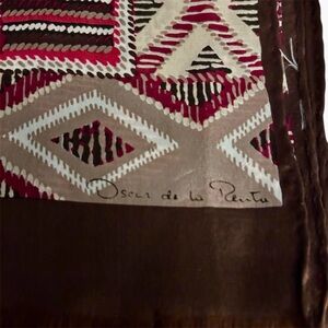 Signed Oscar de la Renta 100% silk scarf in red, beige and brown pattern. Fringe edges. Small hole from tag otherwise in great condition.