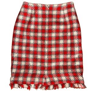 Oscar de la Renta plaid tweed pencil skirt crafted from Italian fabric with a timeless red/orange, ivory, and gray check pattern. Features a classic high-waist pencil silhouette, full lining, and a subtle fringe hem detail that adds texture and interest.