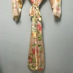 Gorgeous floral robe from Oscar de la Renta Pink Label. Beautiful lace trim on sleeves. Has pockets! Excellent condition. It's a size large, but I'm a xs-s and I wore it no problem, of course it was a little more loose but it totally worked for a kimono style robe. In my opinion it should be a "one size fits most" kind of deal instead of sized, which is why I such in the size category despite what the label says!