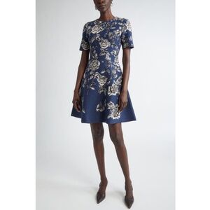 Oscar de la Renta Rose Printed Jacquard Dress Indigo White Medium NWT 25SN112DRJ