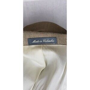 Elevate your wardrobe with this stunning Oscar de la Renta blazer. Made from a luxurious blend of silk and wool, this tan pinstriped blazer is perfect for any occasion, from weddings to business meetings. The blazer features a notch lapel, four-button sleeve button style, and a single-breasted cut with a two-button front button style. With a regular fit and a flat front, this blazer is both comfortable and stylish. The blazer is perfect for any season, whether it's winter, summer, fall, or spring. The blazer is a solid pattern and has a chest size of 48 inches and a waist size of 48 inches. The blazer is made in Colombia and is perfect for those who want a classic, preppy, or sports-themed look.