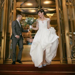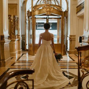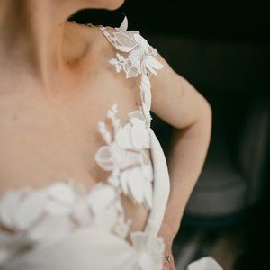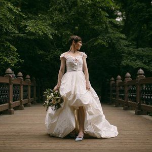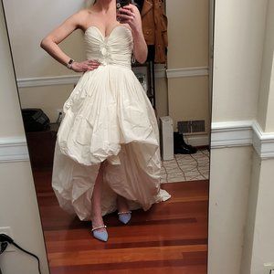 Stunning ODLR taffetta high-low gown. Beautiful floral appliques on the bust and detachable illusion netting cap sleeve topper creating an off the shoulder sweetheart neckline. Illusion netting can be removed to make it a true sweetheart- I tried it on at home without the netting (4th picture).