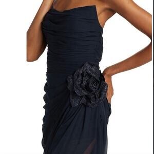 Oscar de la Renta Strapless Floral Appliqué Gown Navy Long Maxi Dress Crystal