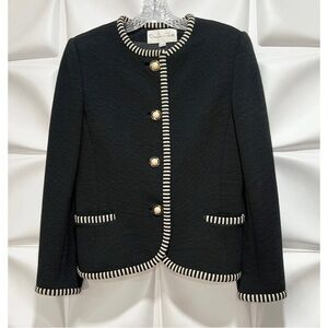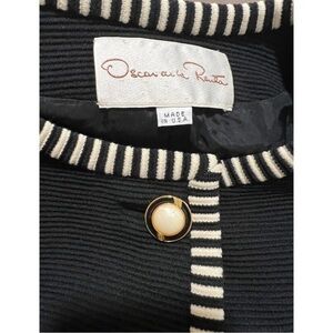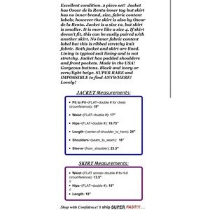 Excellent condition. 2 piece set! Jacket has Oscar de la Renta inner tag but skirt has no inner brand, size, fabric content labels; however the skirt is also by Oscar de la Renta. Jacket is a size 10, but skirt is smaller. It is more like a size 4. If skirt doesn't fit, this can be easily paired with another skirt. No inner fabric content label but this is ribbed stretchy knit fabric. Both jacket and skirt are lined. Lining is typical suit lining and is not stretchy. Jacket has padded shoulders and front pockets. Made in the USA! Gorgeous buttons. Black and ivory or ecru/light beige. SUPER RARE and IMPOSSIBLE to find ANYWHERE! Lovely!