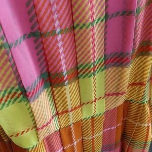 Bold plaid design with striking pink, yellow, and orange tones. Vintage 80s, measurement approximately pit to pit 18", waist 14", total length 39". This dress is amazing. It's vintage, and on the right back, the shoulder has a small hole and spots. please see all the pictures. it could be fixed, or you could turn this amazing dress into the skirt.
