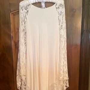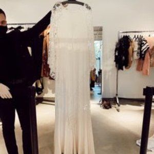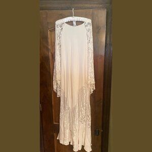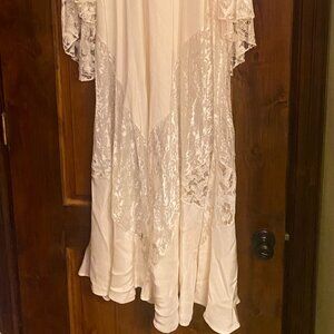 Practically OSFA since it can be cinched with a sash or belt. Light staining at very bottom of hem from storage since it is extremely long but will likely be hemmed regardless of height. No slip.