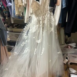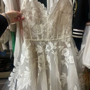 Stunning white lace dress with floral details. Elegant and timeless design. Tulle is ripped on the bottom can be easily fixed (not the lace, the tulle under it) this has never been worn!