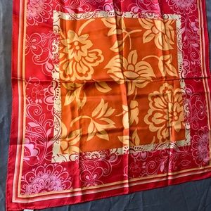 Square silk scarf in cherry red, pink and orange. In new condition.