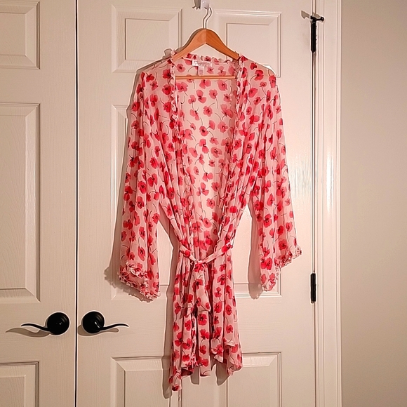 Beautiful pink label sheer floral robe that will look great over your slinky black negligee! 2X polyester machine wash.
