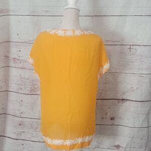 Sheer orange silk oversized flowy tunic/swim cover with white applique detail and large keyhole opening with faux pearl closure. In great condition. The stitching on the brand label has come loose on one side.