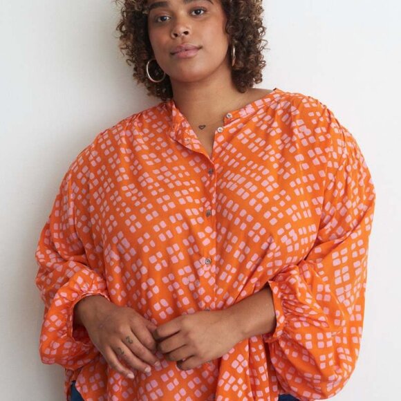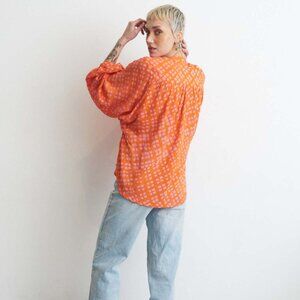 Super lightweight flouncy top. Wear it oversized or true to size. Features button front shell buttons, mandarin collar and gathered sleeves. We love this one for being a top that you can just throw on, over loose or tight pants, and feel super comfortable and jazzy.