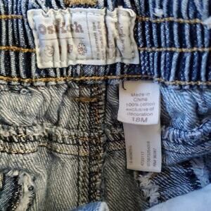 Gently preowned jeans by Osh Kosh. Flower embroidery on back pocket. Size 18 months. Excellent condition. Zip fly and snap closure.