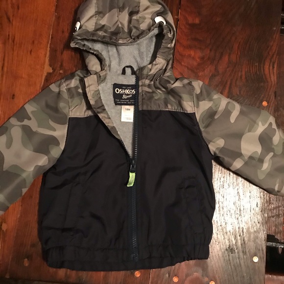 18 month-Osh Kosh jacket. Inside body is light fleece lined, cute navy/camo/dinosaur design.