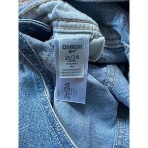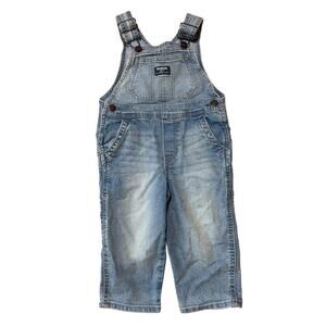 OshKosh B'Gosh denim/jean overalls in blue, size 2T. Features carpenter pants styling and made of 100% cotton. These overalls are durable and strong, ready for action from your toddler!
