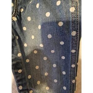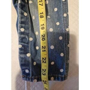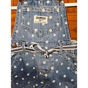 Adorable OshKosh denim overalls in a size 12 months. These overalls are a medium blue wash with white polka dots. They have a relaxed fit and are perfect for everyday wear. The overalls are in good preowned condition.