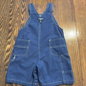 A solid blue set of toddler shorts overalls with the classic Osh Kosh namesake patch on the chest and the vestbak triangle located on the back. These overalls have adjustable straps and snap closures in the legs. They are 100% cotton - much lighter and softer than denim. From non-smoking home. (A-1)