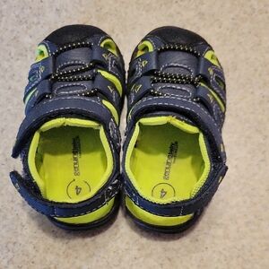 These OshKosh B'gosh sandals boast a vibrant blue and green color palette, featuring a closed-toe design for added protection. The sandals are equipped with a velcro strap closure and a sturdy rubber sole, making them ideal for active summer outings.