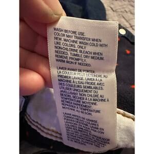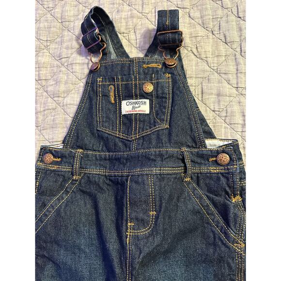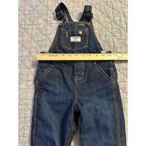 OshKosh B’gosh denim overalls, size 24 months. Dark wash denim with adjustable buckle straps, front bib pocket, and side button closures. Cute heart print lining at cuffs (can be worn cuffed or uncuffed).
