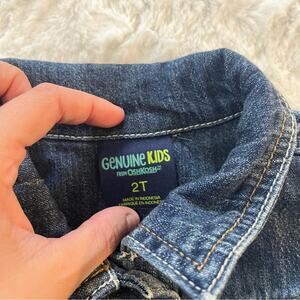 Keywords: oshkosh kids denim jacket, baby jean jacket 2T, toddler girl jean jacket, distressed ruffle collar jacket, western baby jacket, country cowgirl toddler outerwear, oshkosh genuine kids jacket, toddler preppy jean jacket, toddler rodeo denim, classic versatile toddler jacket, coastal cowgirl toddler style, ranch western toddler jacket