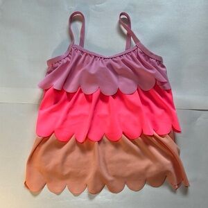 Adorable swim top with scalloped layers. Features shades of pink and orange. Perfect for pool days.