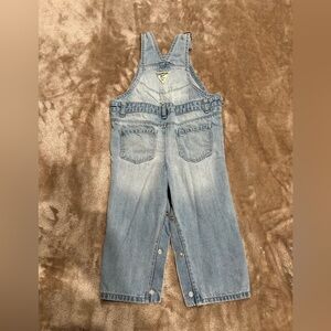 Classic denim overalls with adjustable straps. Features front pocket and side buttons. Perfect for active play.