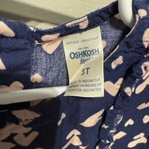 Navy blue heart-patterned dress from OshKosh B'gosh, which has a ruffled bodice and a gathered waist. It is available from various retailers.