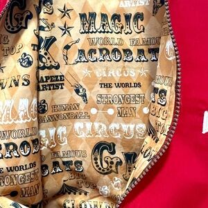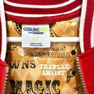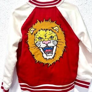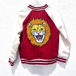 OshKosh B'gosh bomber-style jacket, a red and white varsity-style jacket with a lion theme.