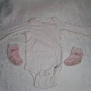 Socks are light pink with dark pink and light teal Daddy's Girl and design on them that matches shorts and onesie! Some discoloration on sock bottoms as pictured.