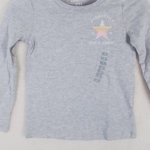 This 100% cotton tee is lightweight and breathable. It features a crew neck, long sleeves, and relaxed fit. This tee is heathered gray and has a star graphic that says "gymnastics, dance, cheer." This T-shirt is new with tag.