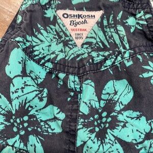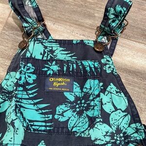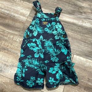 Preowned navy overalls with aqua palm leaf and hibiscus print Carpenter style pockets on legs