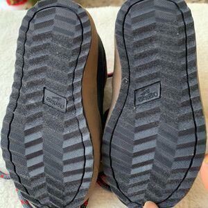 OshKosh dark blue/brown, grey back trim, red interior, laced unisex baby booties, brand new, no tags, excellent condition, size 5M.