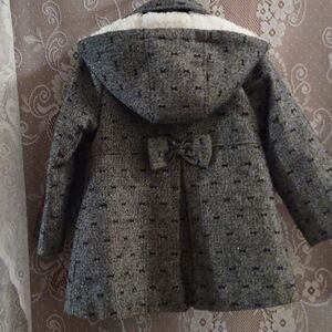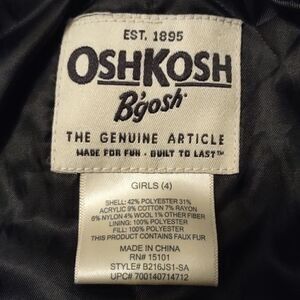OshKosh B'Gosh size 4 Navy girls dress coat double-breasted attached fur lined hood, two front pockets, bow accent metallic thread throughout, machine washable, excellent condition