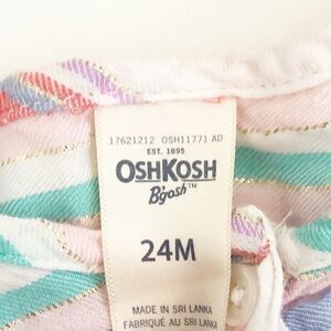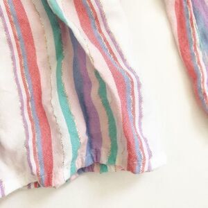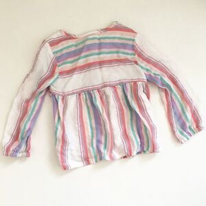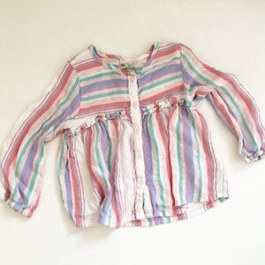 Toddler girls pastel button down flowy shirt. Pinks, purples, teal and white with gold metallic stripe. Skirted bottom, long sleeves, full button front. Size 24M